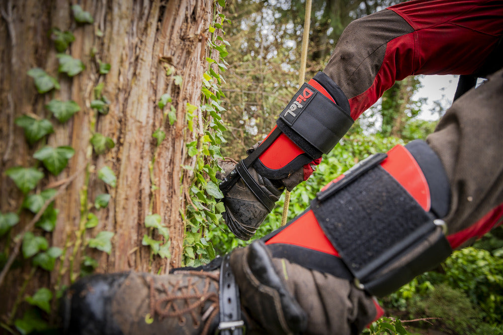 The lower classic straps are made from BioThane material and are manufactured in the USA by Weaver. These straps are extremely durable, waterproof, robust, and highly resistant to resin and sawdust, easily withstanding the daily demands of tree care. This ensures the climbing spur fits securely without any play, while the 105 mm wide upper VELCRO strap simultaneously provides optimal pressure distribution. The shells of the Distel climbing spurs are height adjustable, allowing you to perfectly adapt the spurs to your leg length. The PTFE-coated spikes make it easier to disengage from the wood, allowing you to work with less effort and climb with less stress.