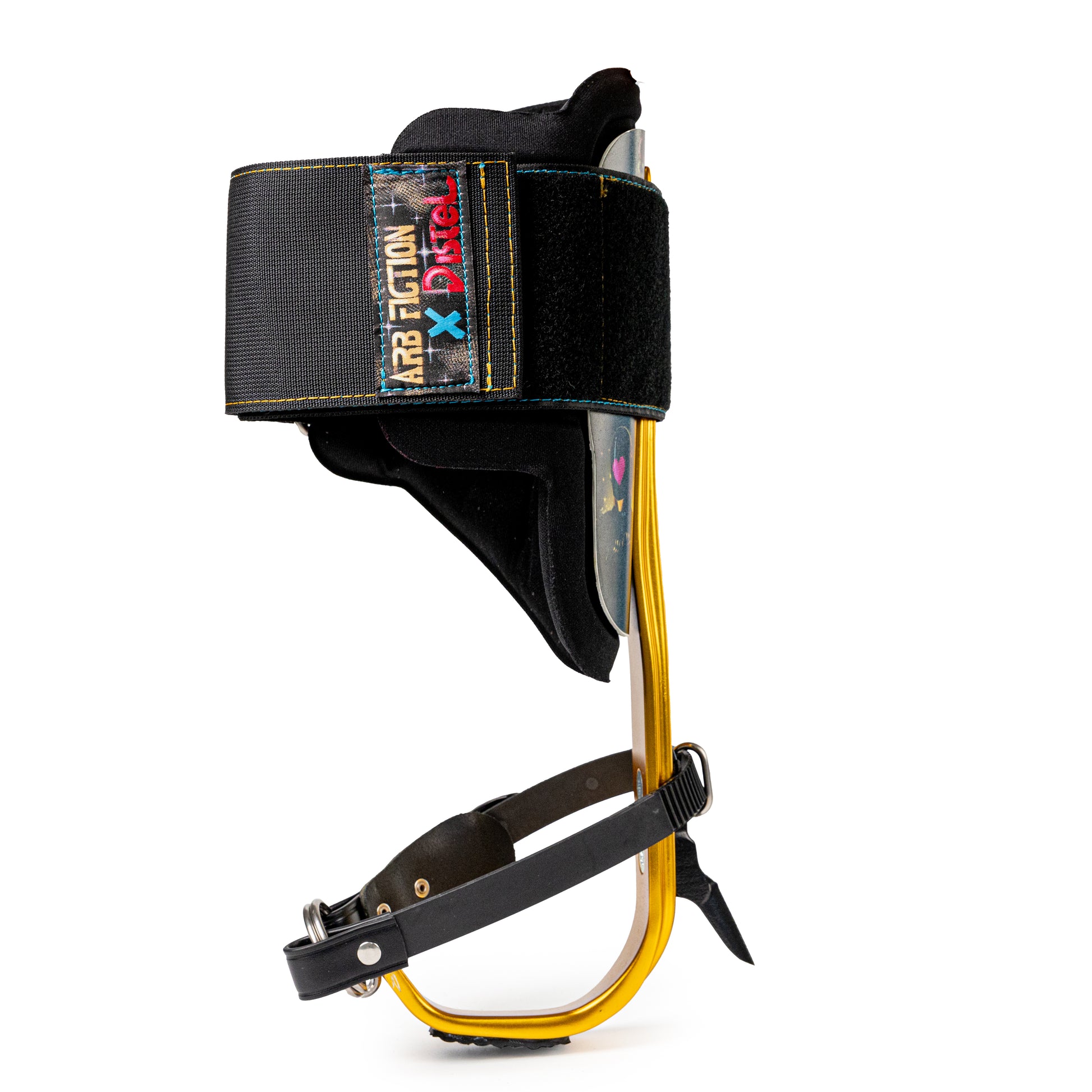 Distel x Arb Fiction Limited Edition Alu Plus Tree Climbing Spurs were specially developed for comfortable and safe climbing. Thanks to DMM’s precision hot-forging process, the shaft conforms perfectly to the ergonomics of your lower leg, ensuring optimal weight distribution. The 45 mm wide, forward-angled stirrup provides a stable platform and significantly eases climbing. The ergonomically shaped Plus shaft distributes pressure evenly, making extended work periods more comfortable. A Vibram rubber sole gives you secure footing on branches while protecting the tread surface.