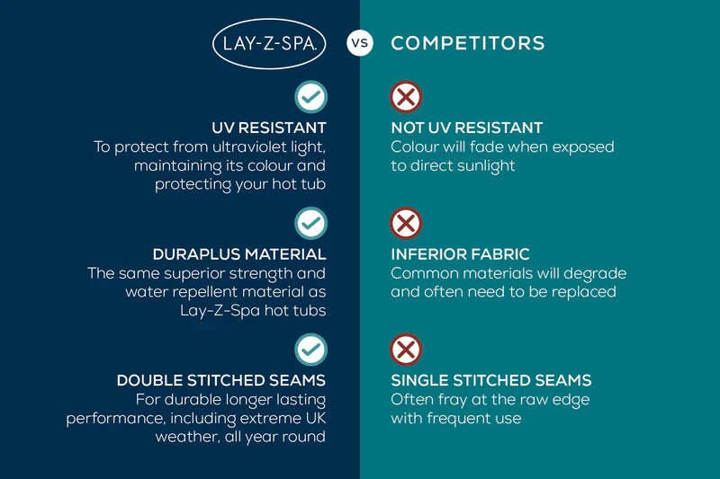 The Lay Z Spa thermal hot tub covers are made from ultra strong 3 ply UV resistant and completely water repellent Duraplus™ material, the same as our hot tubs. To be used only when the hot tub is fully set up with water and the inflatable lid and cover are in place.