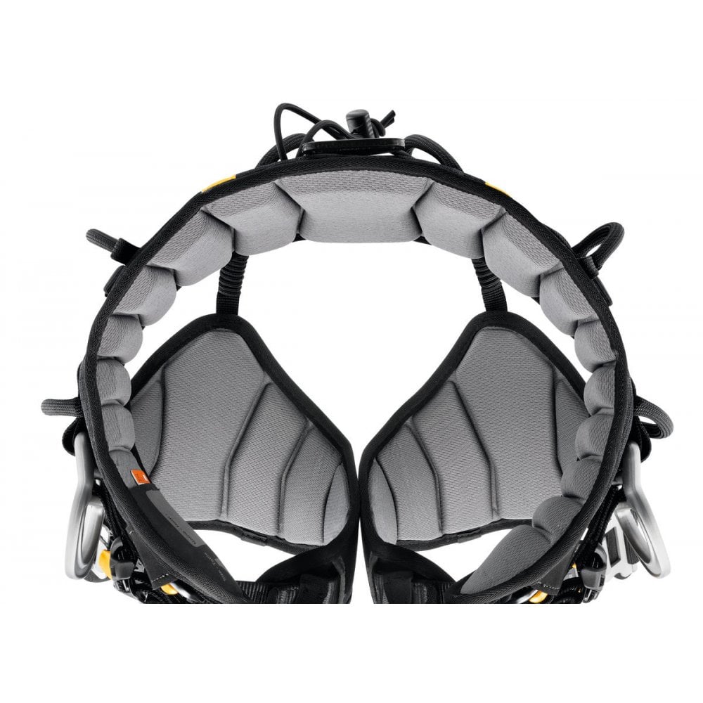 Harness designed for using single-rope ascent techniques: ventral attachment point for installing a ZIGZAG or ZIGZAG PLUS mechanical Prusik with CHICANE and KNEE ASCENT accessories, and a rear buckle for installing a CROLL ventral rope clamp with SECUR shoulder straps.