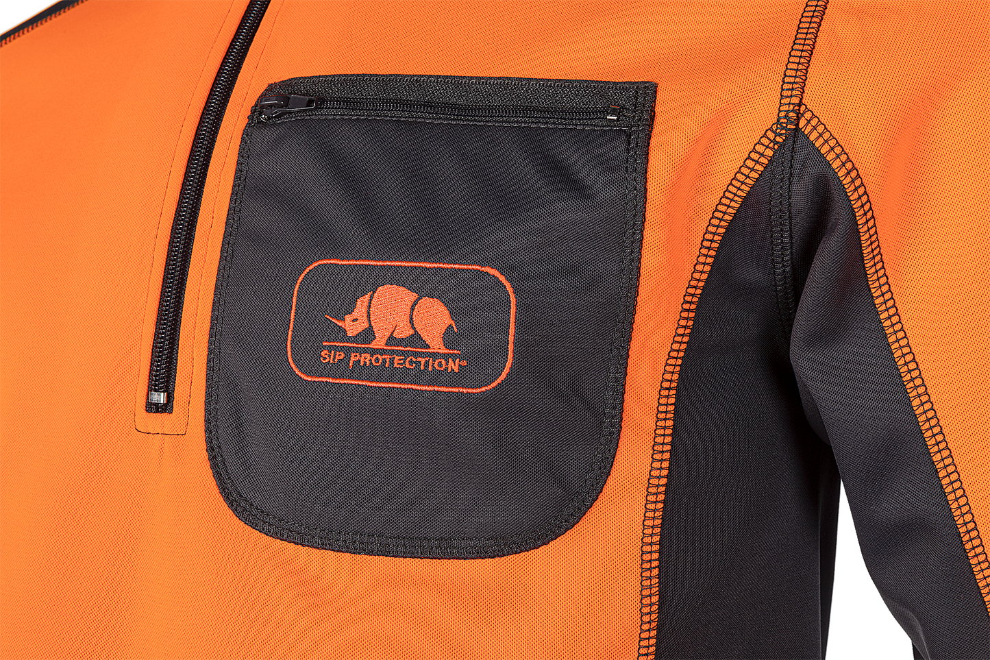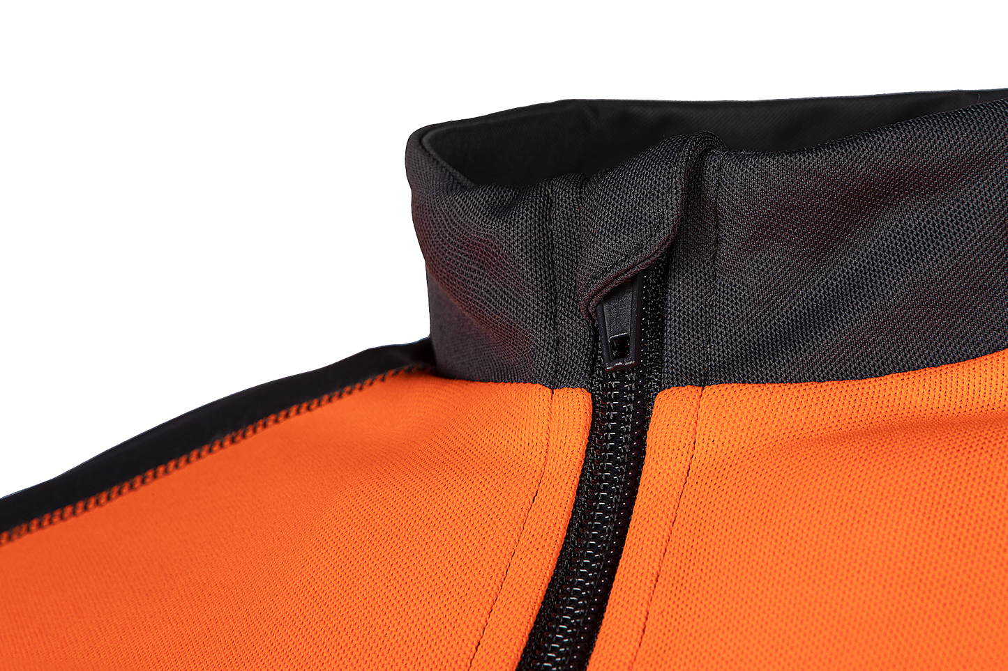 - Zip closure from the chest up to the neck with anti-irritation flap