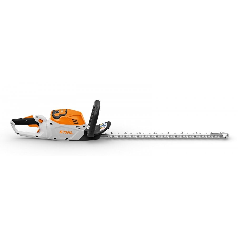 Cordless hedge trimmer with very powerful cutting performance for demanding applications, such as trimming bushes and tall hedges. Laser-cut, diamond-ground and hardened blades, blade geometry in a patented teardrop shape for perfect cuts and a healthy hedge. Effortless and ergonomic working thanks to optimal power tool balance, rotatable multi-function handle, loop handle with inner switch, and STIHL anti-vibration system. Anti-block system for easy change of the cutting blades' rotational direction in the event of blockages.